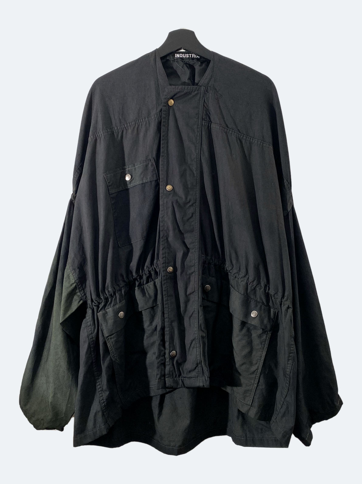 Capes made from water repellent sleeping bag cases, M-1945, overdyed. With snap button closure on the sides or with snap button sleeves and cargo pant pockets.