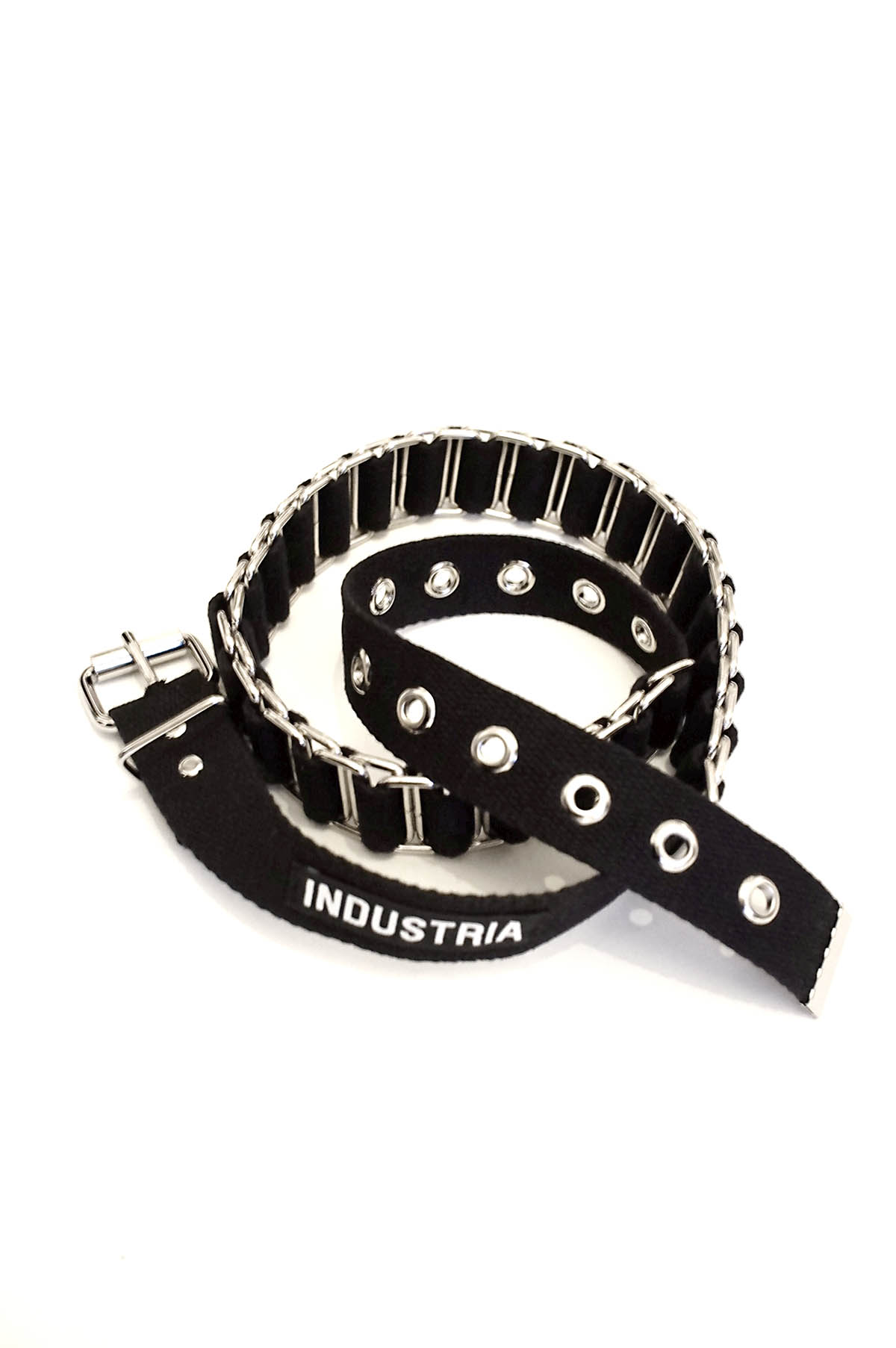 Handmade cotton belt with rivets, eyelets and woven metal square rings.