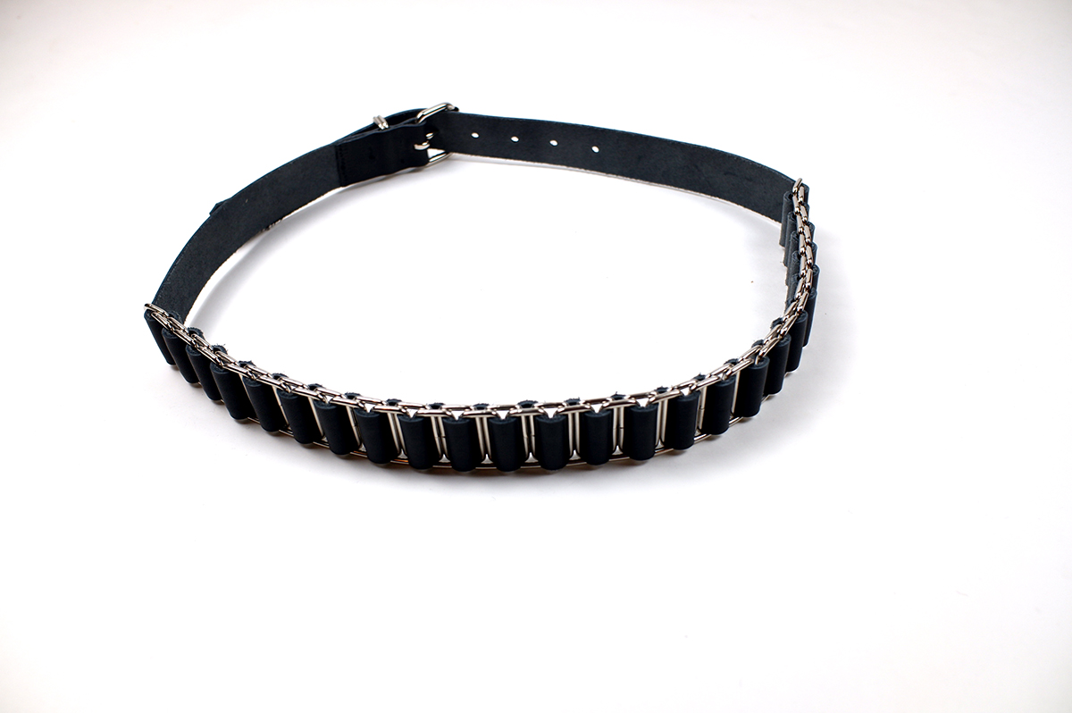 Handmade leather belt with woven metal square rings and hand engraved catalogue number.