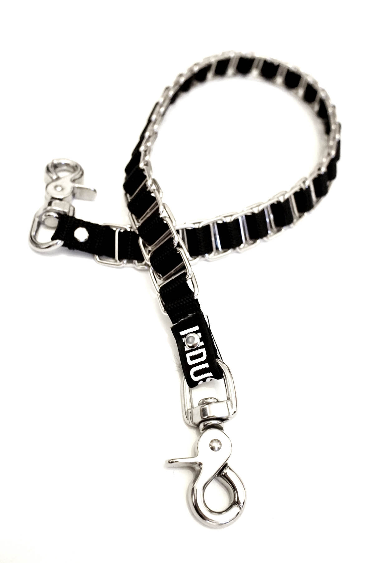 Handmade nylon keychain with rivets, carabiner and woven metal square rings.