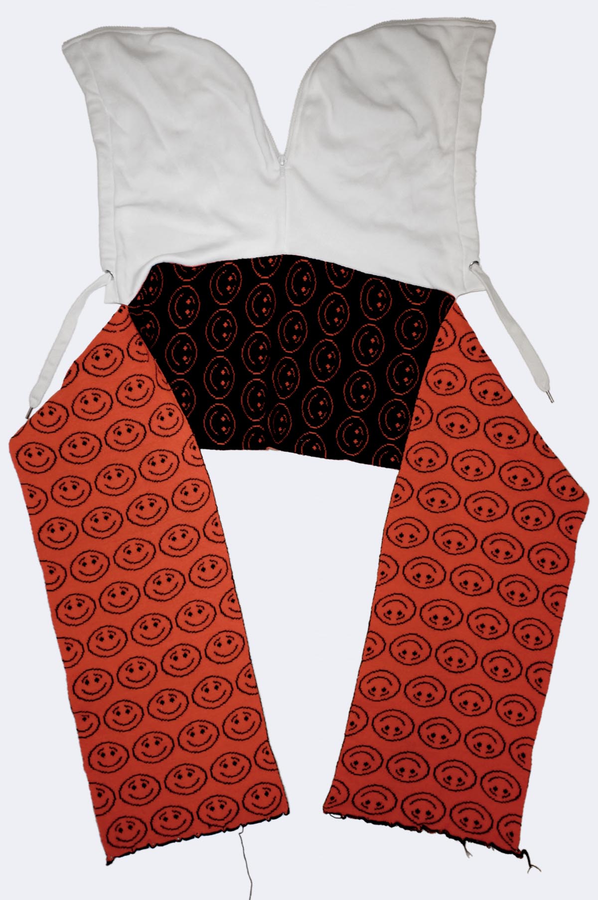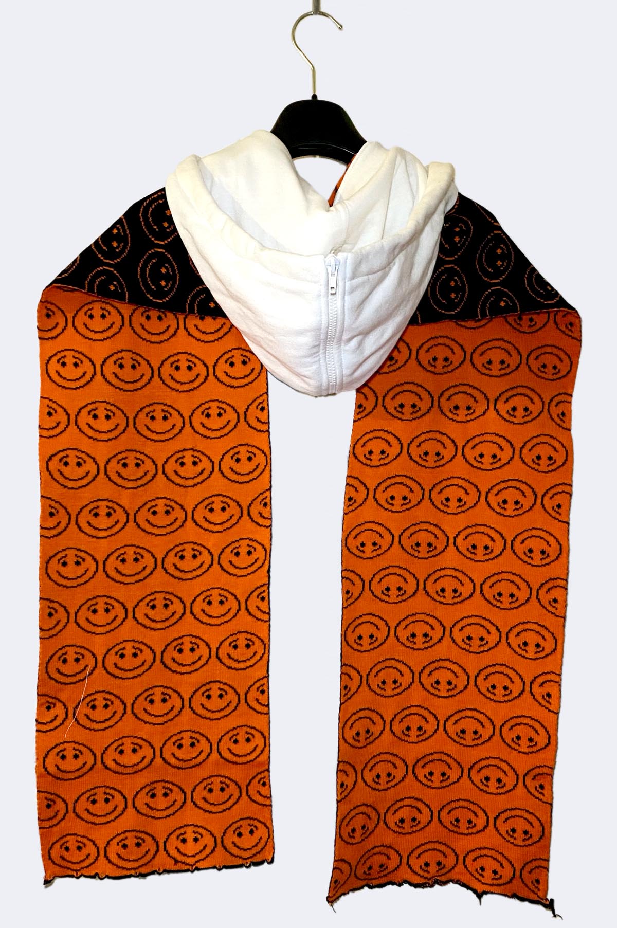 White sweatshirt hood with center zipper opening attached to an intarsia scarf.
