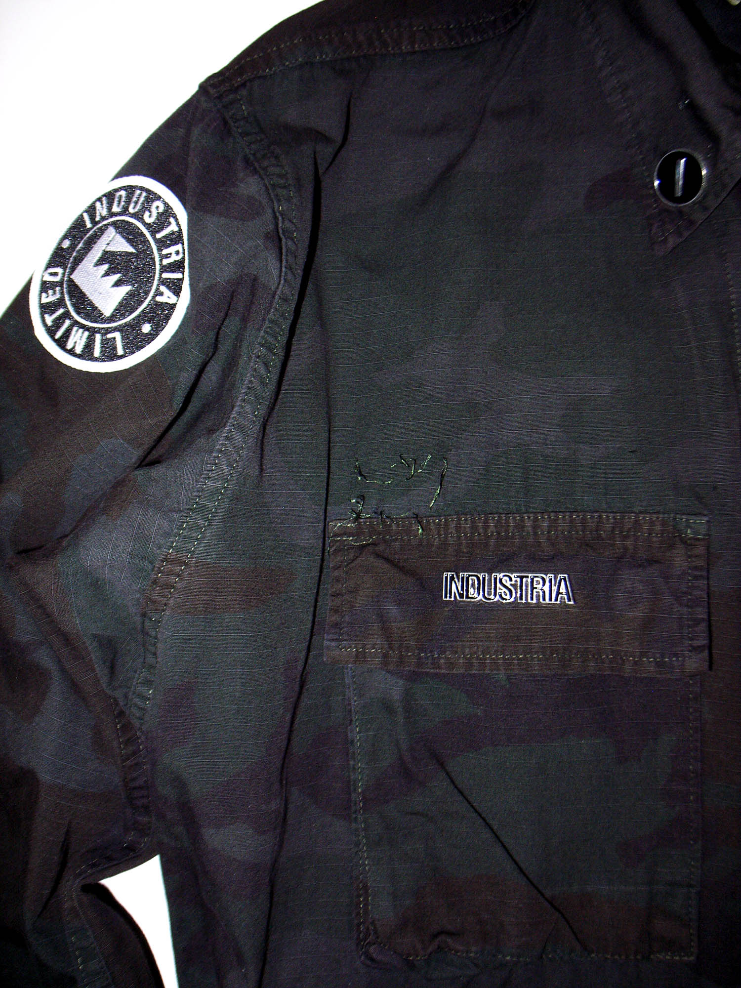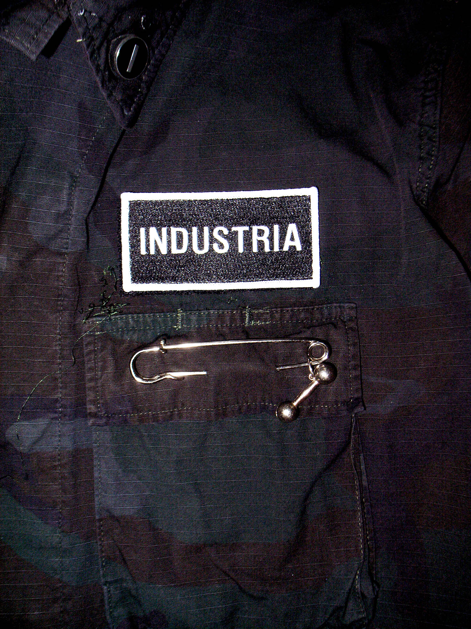 JUNGLE JACKET CUSTOMIZED overdyed special additions and customisation of pins and buttons by Robi Insinna. As worn by Douglas J MacCarthy of Nitzer Ebb w/ black bandana.