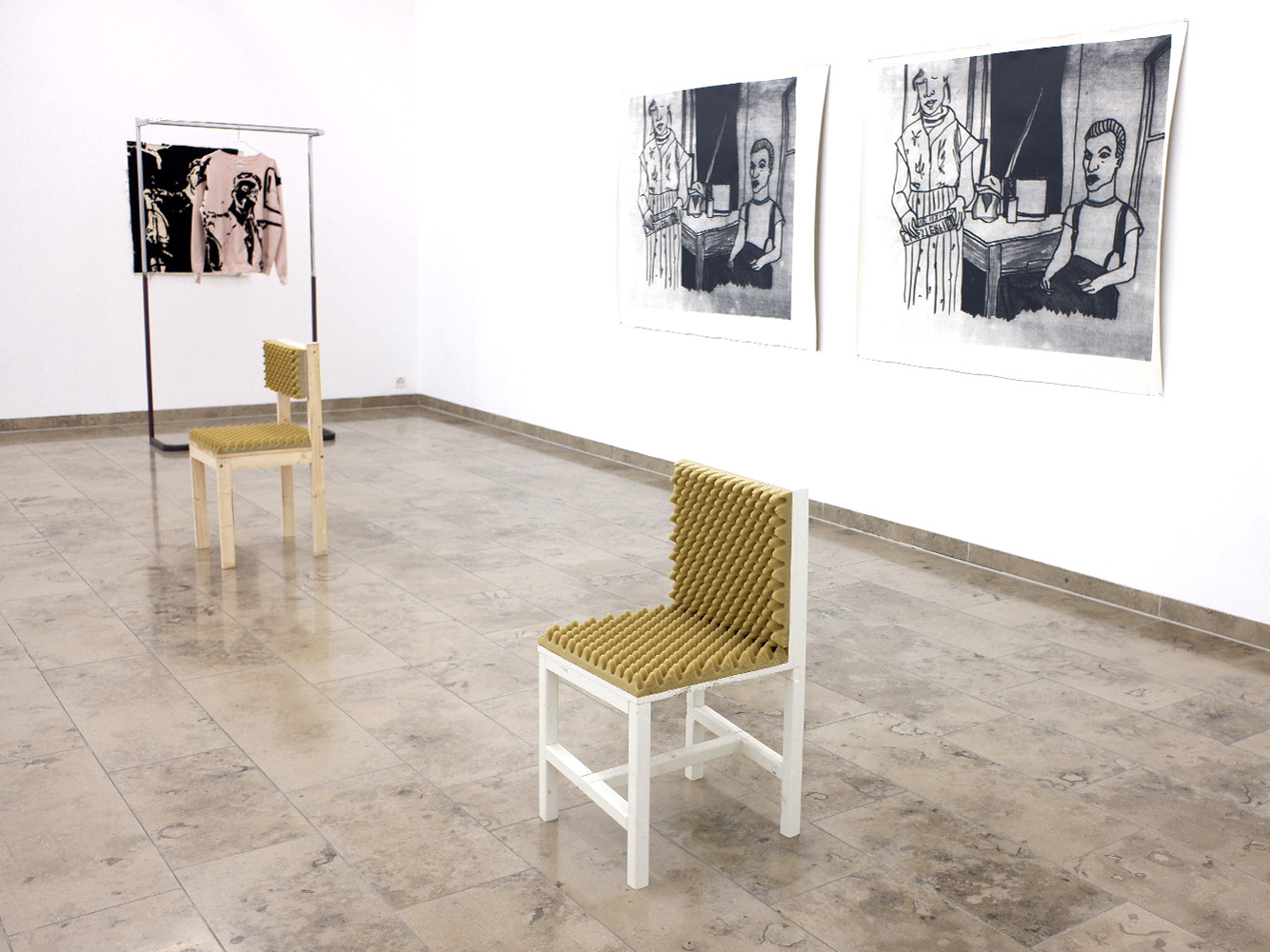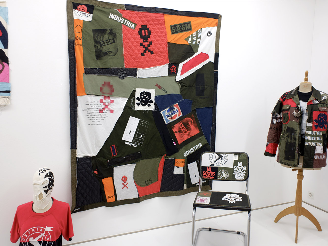 works on fabric, painting, screenprints, products, objects and a video installation.